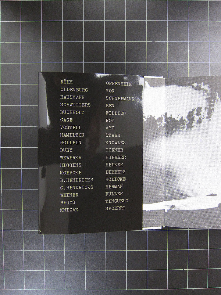 Contributors to this publication are Ay-O, Joseph Beuys, Erich Buchholz, Pol Bury, John Cage, Philip Corner, Jan Dibbets, Robert Filliou, Buckminster Fuller, Geoffrey Hendricks, Richard Hamilton, Raoul Hausmann, Michael Heizer, Jan Jacob Herman, Bici Hendricks, Dick Higgins, K.H. Hoedicke, Hans Hollein, Douglas Huebler, Milan Knizak, Alison Knowles, Addi Koepcke, Franz Mon, Claes Oldenburg, Dennis Oppenheim, Gerhard Rühm, Diter Rot, Carolee Schneemann, Kurt Schwitters, Daniel Spoerri, Frances Starr, Jean Tinguely, Ben Vautier, Wolf Vostell, Lawrence Weiner, Stefan Wewerka.