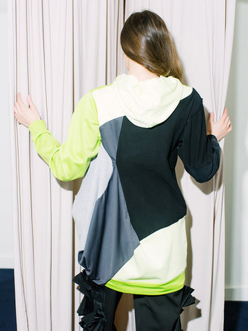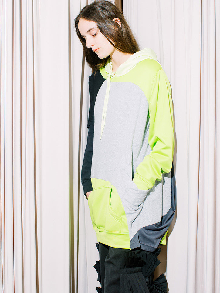 They made a hoodie! It's on the longer side, with cotton and nylon patchwork panels. Multiple pockets. Neon greens.