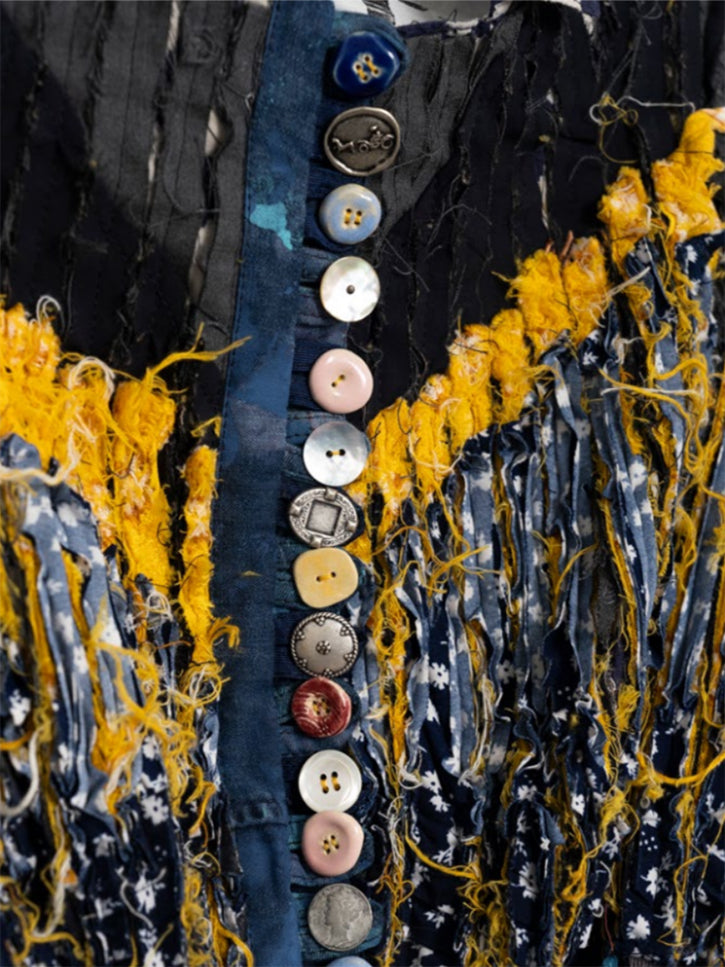 From the Homesick, Again collection. All deadstock fabrics, five different reclaimed garments, multiple textile remnants, found buttons, ceramic buttons hand made by Jessica Marie Mercy. JRAT is zero waste, 100% upcycled and recycled and sustainable. All handmade. One of a kind.