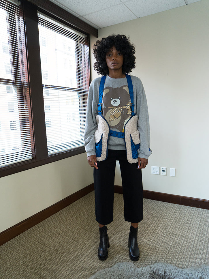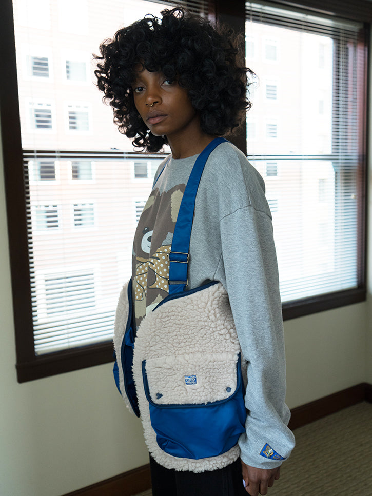 This utilitarian bag/backpack/utility vest/fashion piece features adjustable straps, large flap pockets, and the ability to fold up into itself and snap shut, of corse. The lining is nylon, the exterior is fleece. It's both an accessory, essential, and the exclamation point on an otherwise clean cut outfit. Unisex.