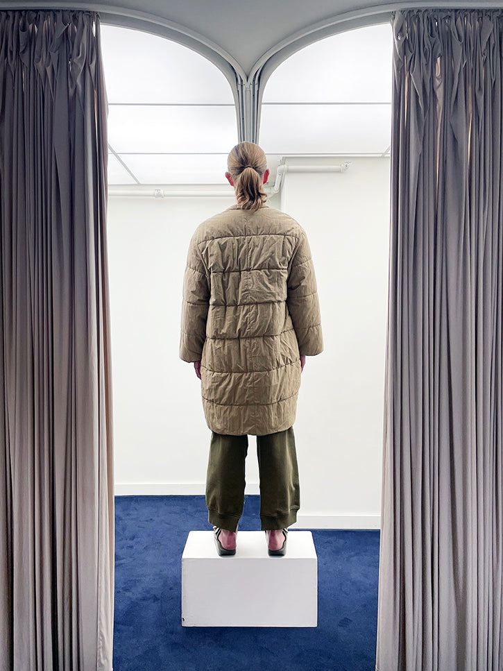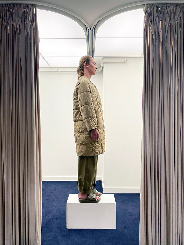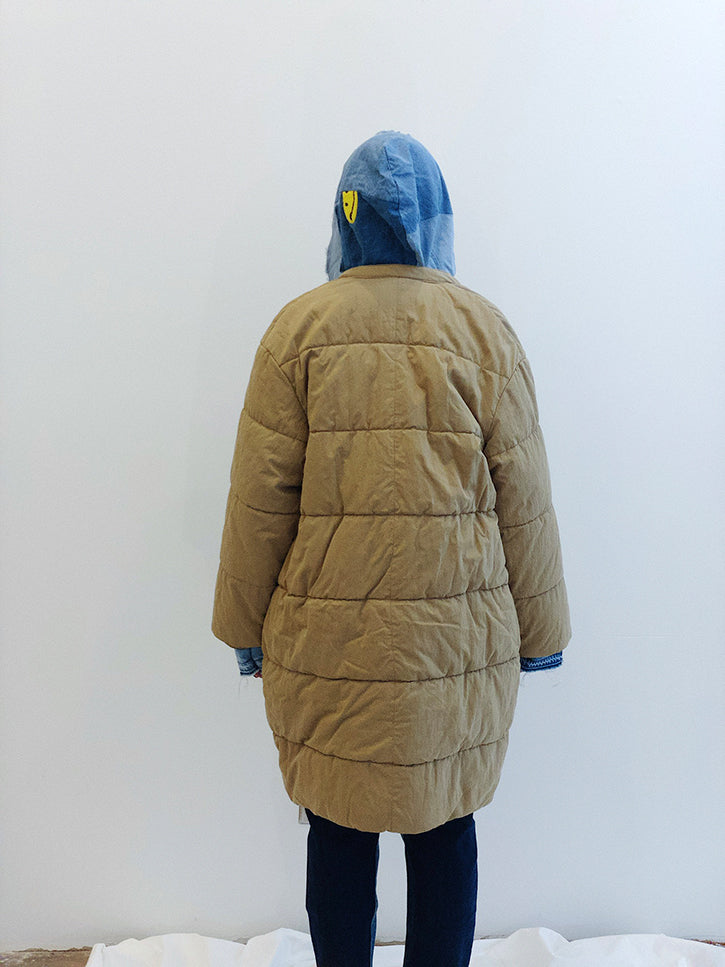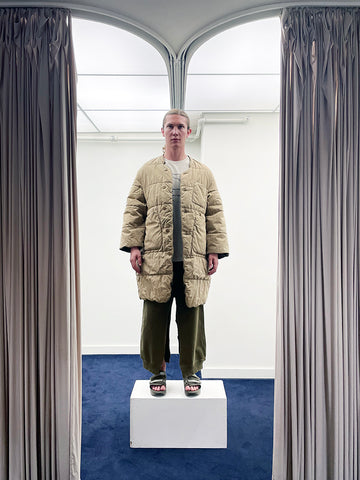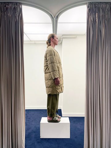 A full-on winter coat, big and puffy. But it's not a "puffer", in that the quilted exterior is a flat cotton, giving it a counterintuitive, sweater-like feel. Lined in a cozy fleece, it feels like a bathrobe. Three front patch pockets. It's so simple, so huge. Unisex.