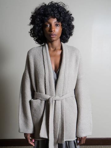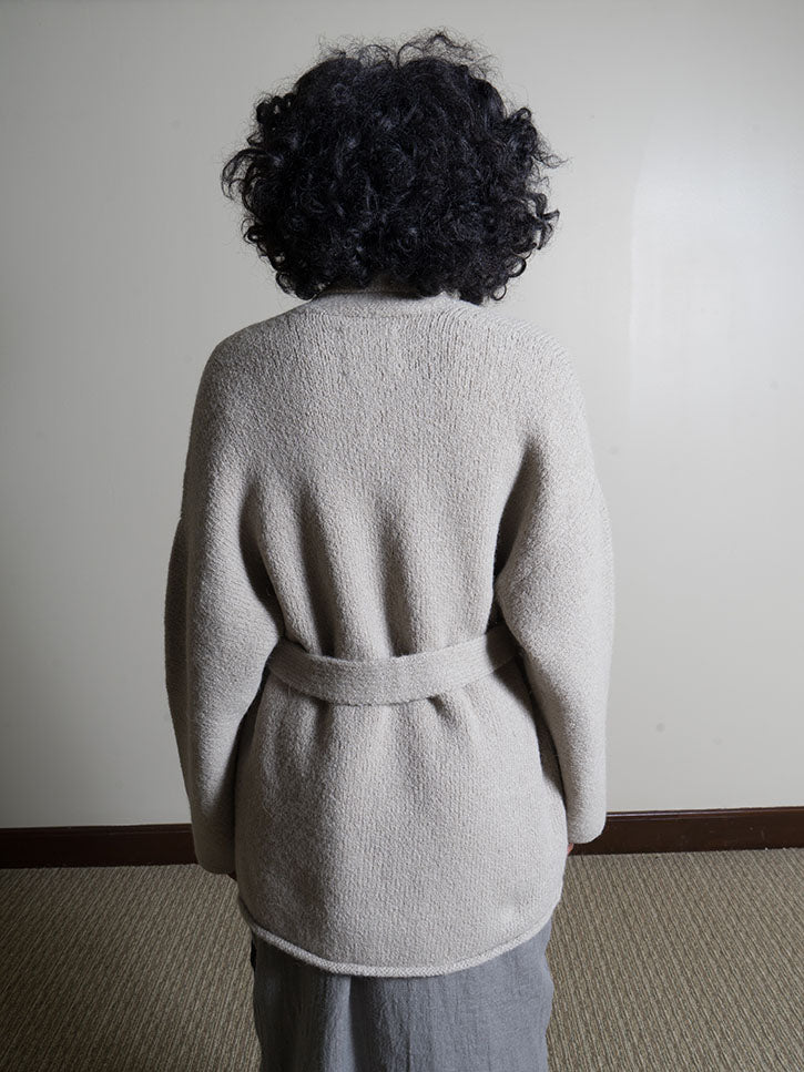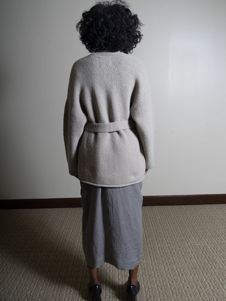 A new style cardigan, taking some of the best features of the popular shawl and capote silhouettes. Warm enough to act as a coat in many climates, or transitional into winter. Super soft, versatile, and kind of one of those pieces that becomes indispensable immediately. Front pocket.