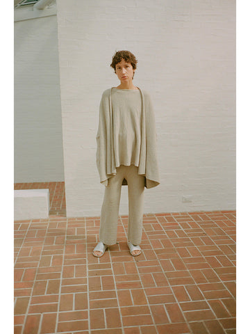 Lauren Manoogian's most popular pant style, with an update. Knit with stretch, easy, subtly belled at the hems. Wide rib at elastic waist for comfort, side pockets. Super soft, they feel like sweats, but look much more polished.