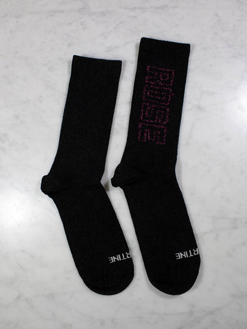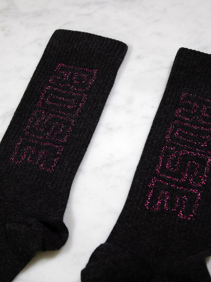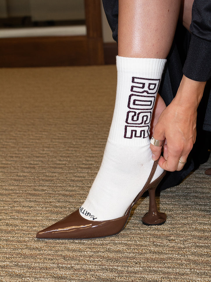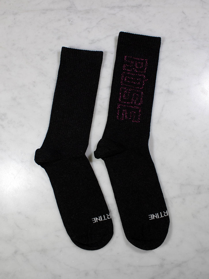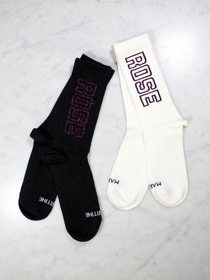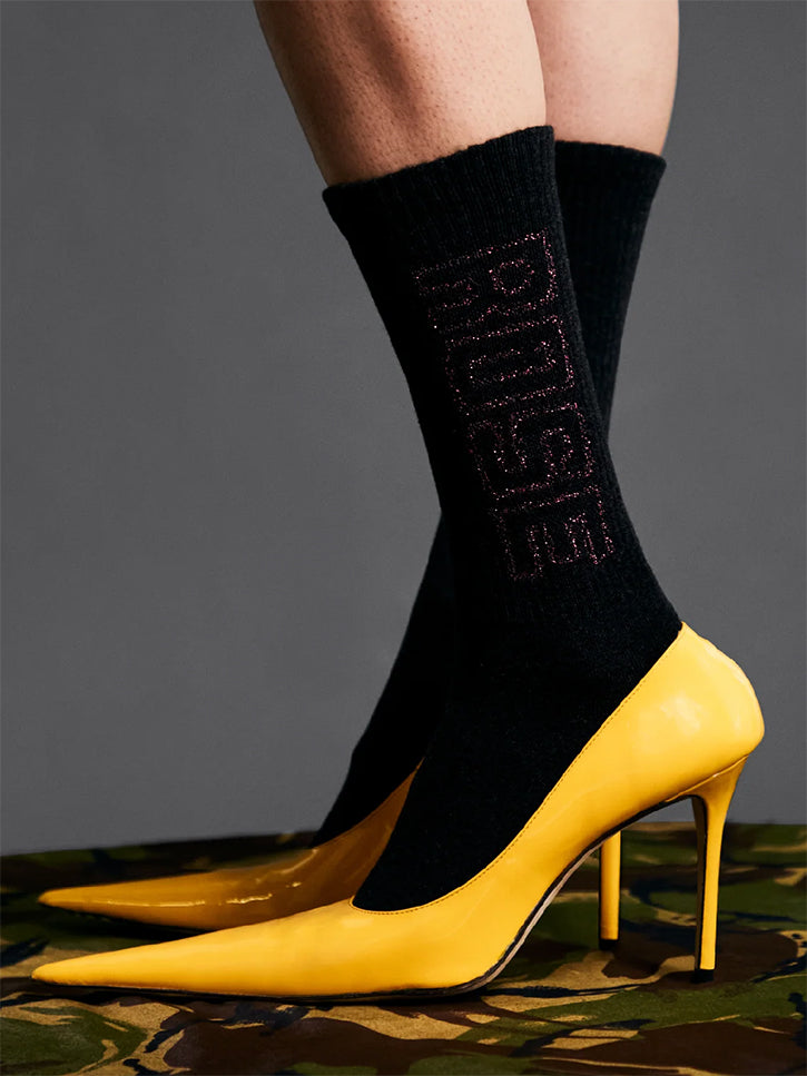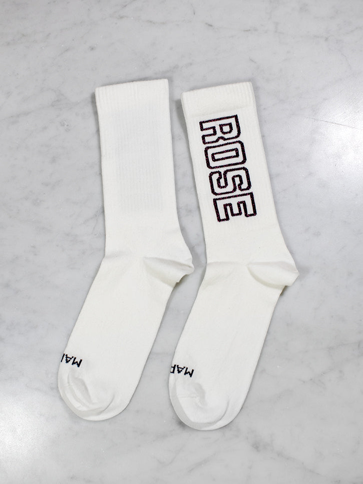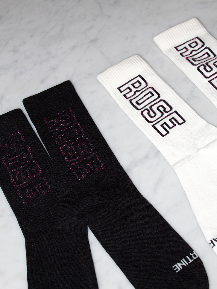 The classic ribbed athletic sock with a signature Martine Rose graphic, which is different every season and sometimes for each style. A black and white two-pair pack (two pairs! two colors!), available in two sizes 35-39 / 40-45.