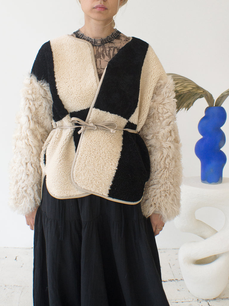 A collarless, kimono-style coat with belt closure, made with carefully selected sheepskins of various textures. Ms. Silvano has created her own patchwork patterns, taking into consideration complementary colors, weights, and fibers. She uses organic, ayurvedic dyes in her color process for a rich range of tones. Back features her diamond motif, body overall trimmed in leather. The result is a singular garment with a life all its own. Fully reversible.