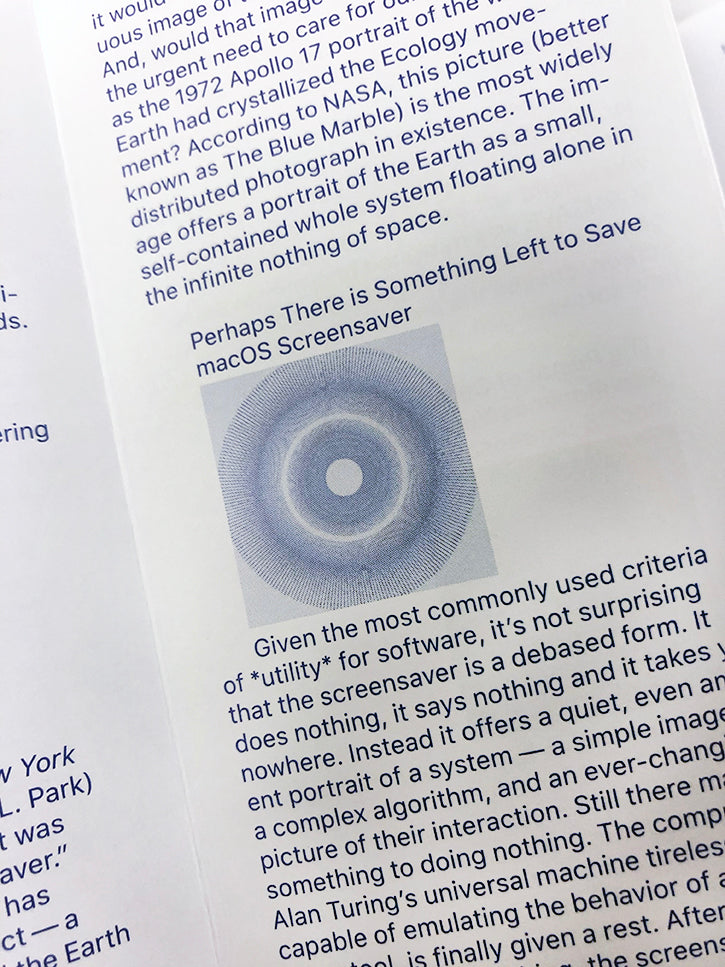 Given the most commonly used criteria of *utility* for software, it’s not surprising that the screensaver is a debased form. It does nothing, it says nothing and it takes you nowhere. Instead it offers a quiet, even ambient portrait of a system — a simple image, a complex algorithm, and an ever-changing picture of their interaction.