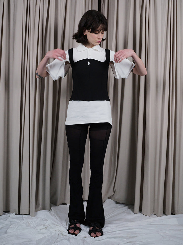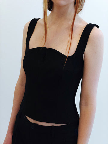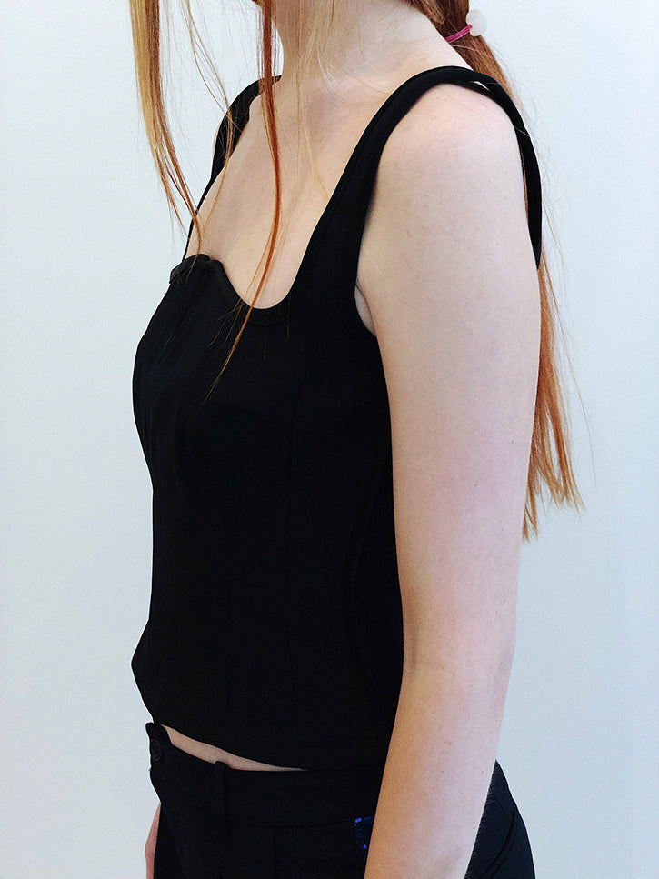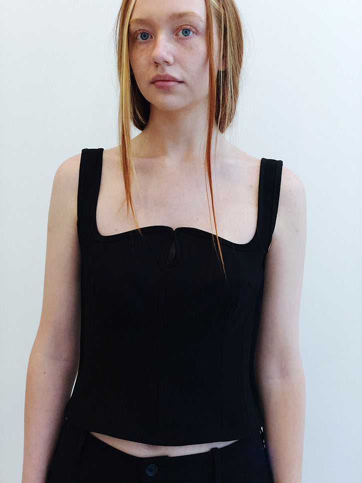 We searched for a long time, trying to find a top that looks a bit like a corset, but not one reminiscent of fantasy or bogged down in ultra-feminine tropes. We've found it in this one by Paris Georgia, which is more elemental in its line and fit. Made from a Japanese bonded stretch poly, the fit forms to the body, is snug but not tight. Feels like a proper top, not a costume.