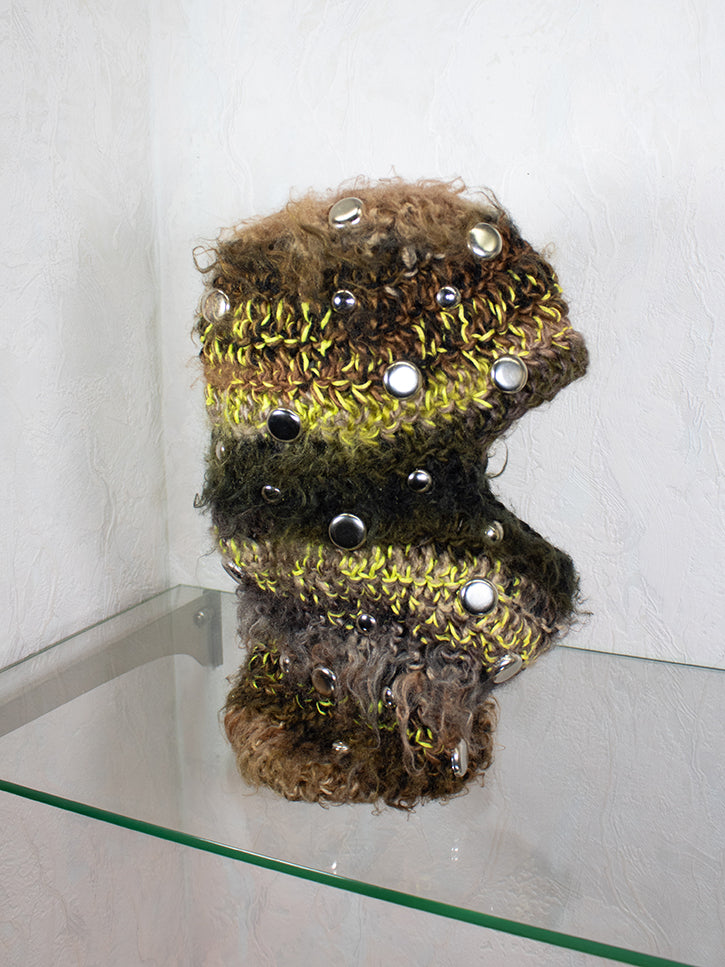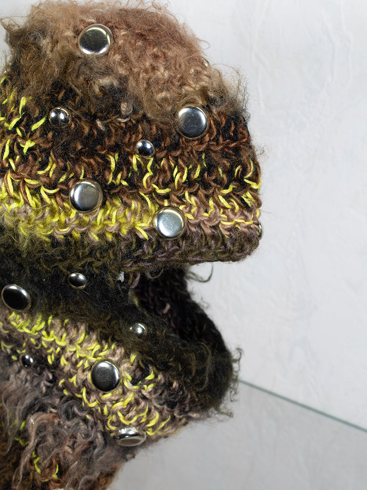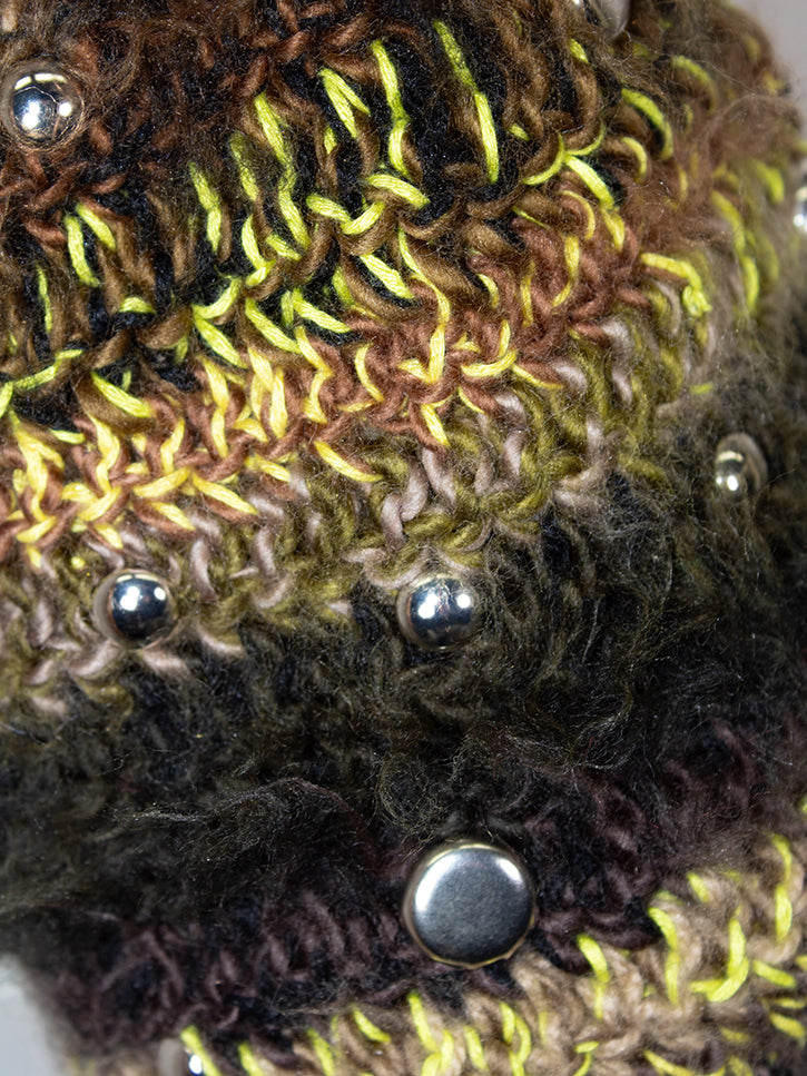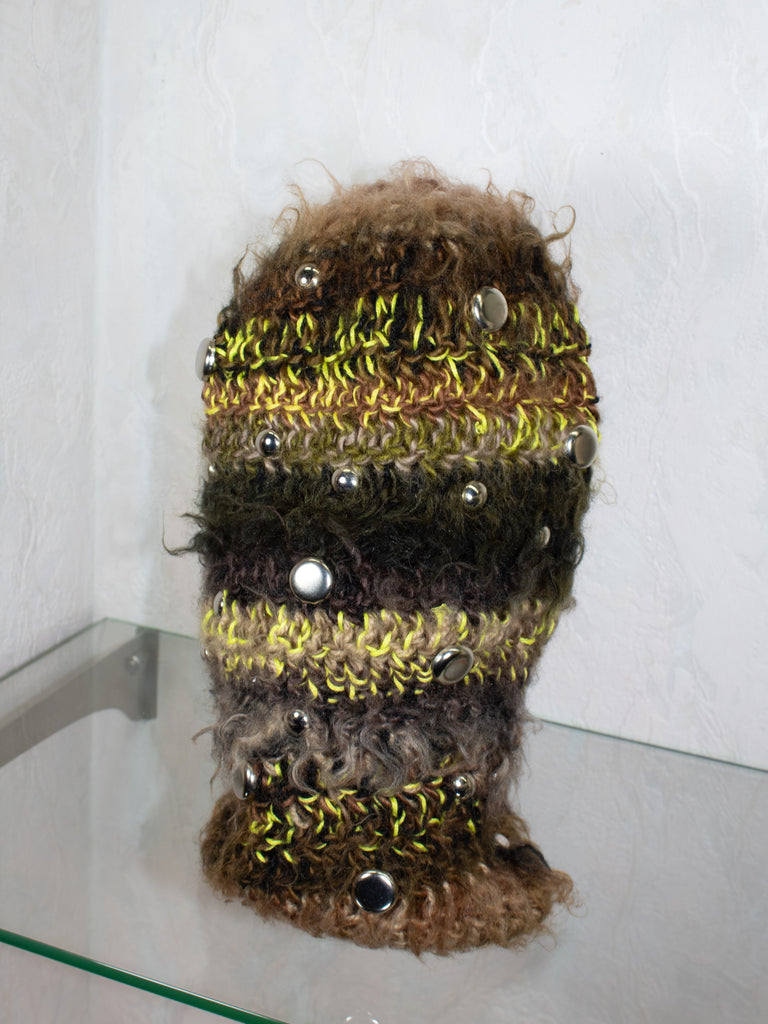 Finally, the perfect piece to perform the chicest heist. An ultra-soft balaclava that can be worn over the head or around the neck like a de-hooded hoodie. Hand-knit with metal charms and studs.
