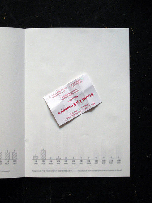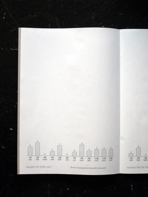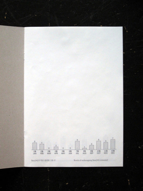 The Korea-based conceptual artist compiles annual reports of his activities, purchases, and general living. An on-going archival project that takes a different form in each volume. He didn't eat/spend as much this year. What might we glean from the paucity of receipts, and from the blurred type throughout? (No, you're not imagining that the thing is soft and impossible to see in these images. Also in real life, not as bad, but it's blurry.) One way of looking at what makes up a life. Edition of 100.