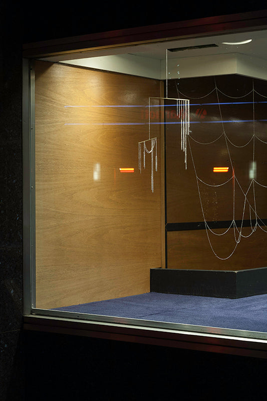 The Stand Up Comedy window features an installation by the jeweler Samma (2017). Delicate chains are hung to balance between shadow and light, emphasizing negative space through patterning and materiality. Photo by Melanie Flood.