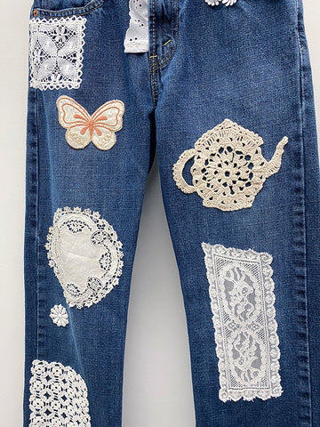 Recycled denim jeans adorned with vintage doilies, lace, and appliqués. Each are one of a kind.