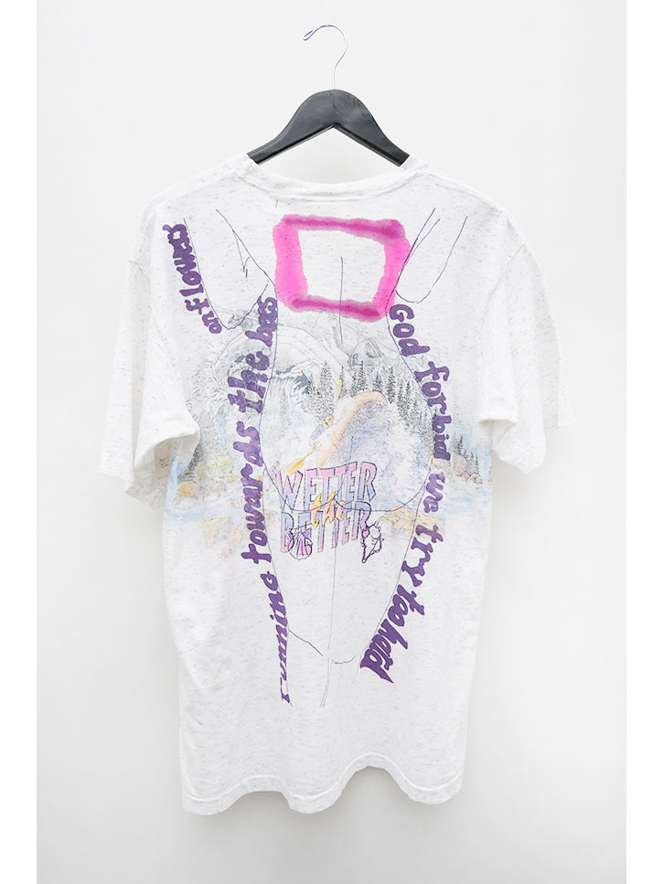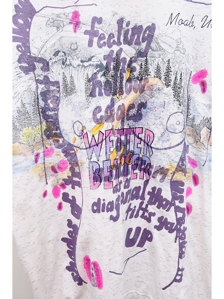 Handpainted vintage t-shirt with burn out poetic phrases, uplifting and thoughtful, and an entreaty as well. With figurative illustrations.