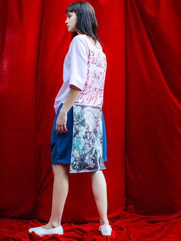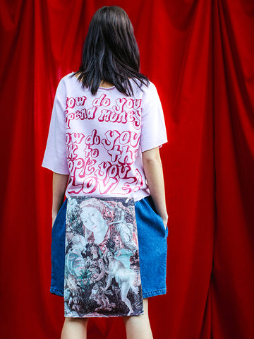 This handpainted sweatshirt includes a long rear hem with pre-raphaelite women.