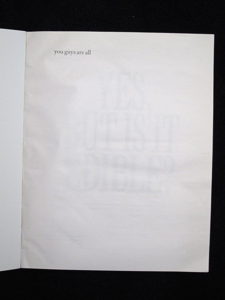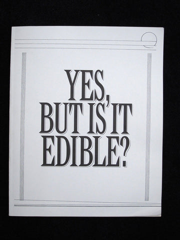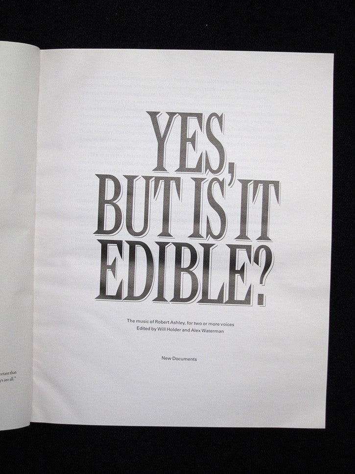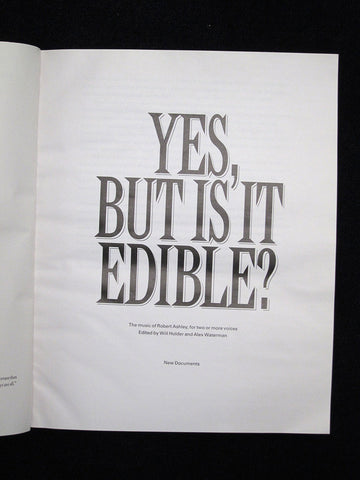 Yes, But Is It Edible? is the fourth in a series of publications produced with or by Will Holder and Alex Waterman that address a musicological perspective on scoring speech and the role of printed matter in collective forms of reading and writing: Agape (Miguel Abreu Gallery, 2007); Between Thought and Sound (The Kitchen, 2008); and The Tiger's Mind (with Beatrice Gibson; Sternberg Press, 2012).