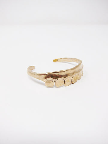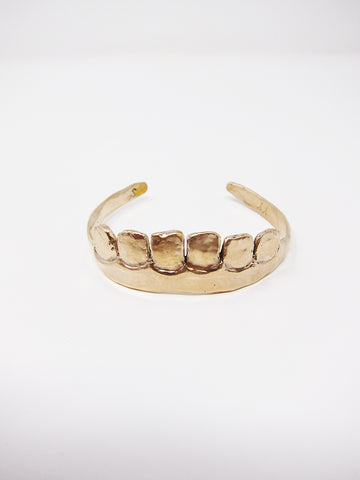 Made from brass, this bracelet is entirely handformed. Darkly humorous, theatrical, and weirdly understated, if that makes sense.
