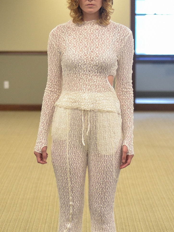 Stretch lace trousers that feel like sweatpants, they're so comfortable. Structured ruffle hem, wide elastic waistband with drawstring. Two side pockets, one rear.